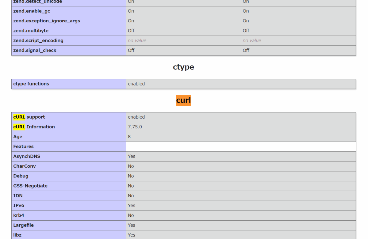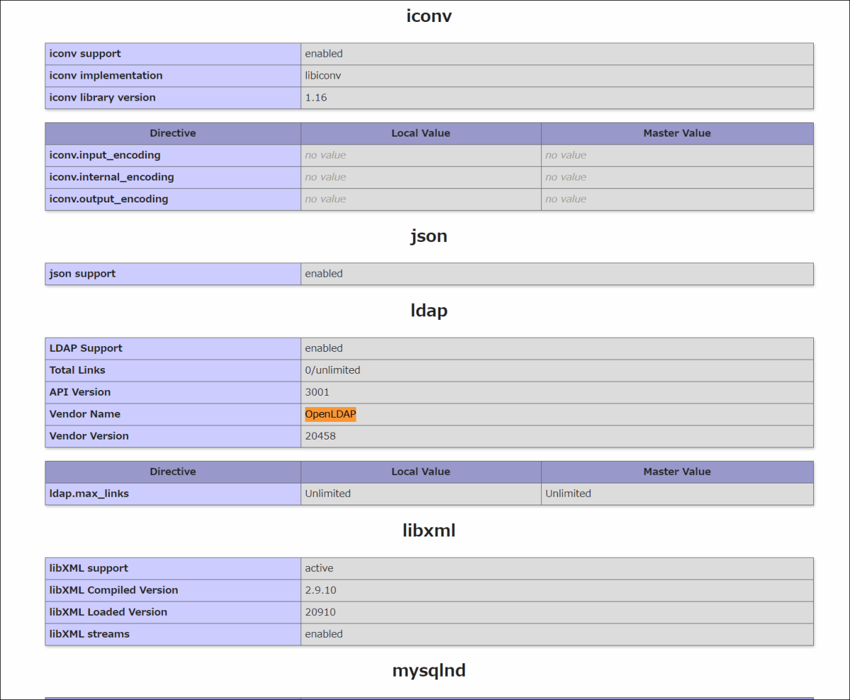 phpにpostgresql,openldap,curlが組み込まれているのが確認できます。