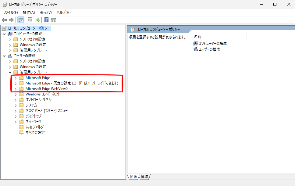 ユーザーの構成 → 管理用テンプレート の中に3項目追加されていて、Microsoft Edge が追加されています。
