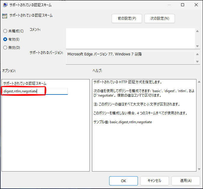 basic,digest,ntlm,negotiateの各値を使用して構成できます。値が複数ある場合はコンマで区切ります。