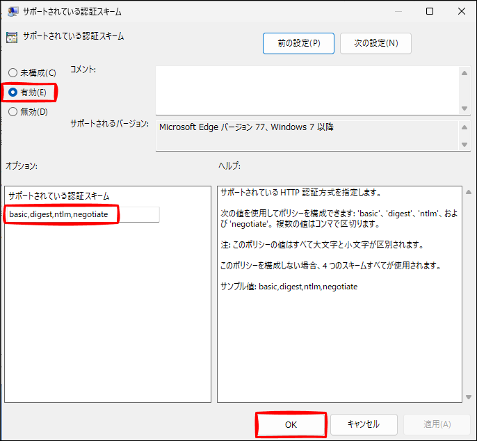 サポートされている認証スキーム は、HTTP 認証スキームを指定するための設定です。この設定は、