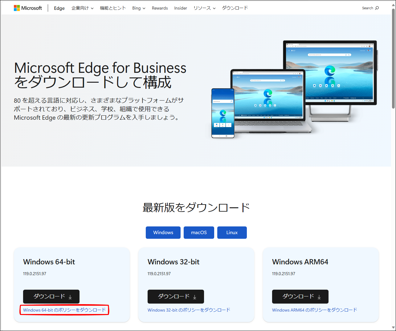 Microsoft Edge Enterprise ランディング ページ に移動して、Windows 64-bit のポリシーをダウンロード をクリックします。