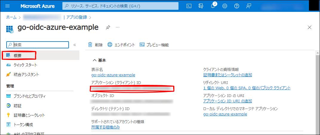 アプリケーション (クライアント) ID から clientID(後で行うアプリ側設定項目)を確認しておきます。