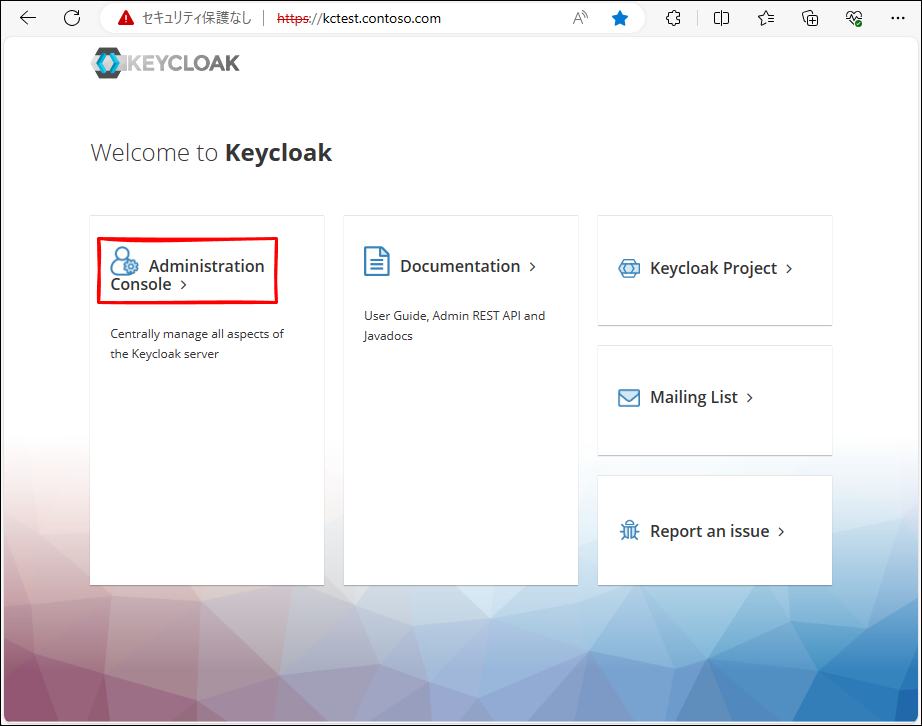 今回、Keycloak の URL は、https://kctest.contoso.com とします。