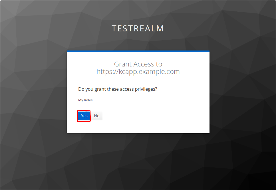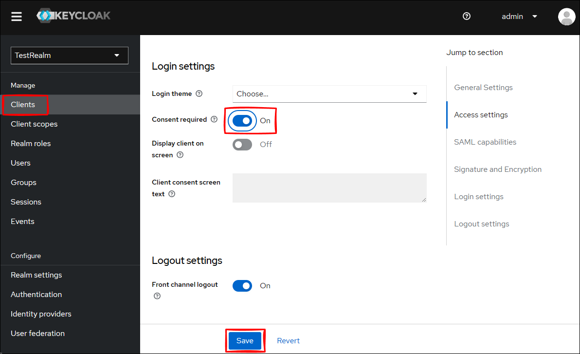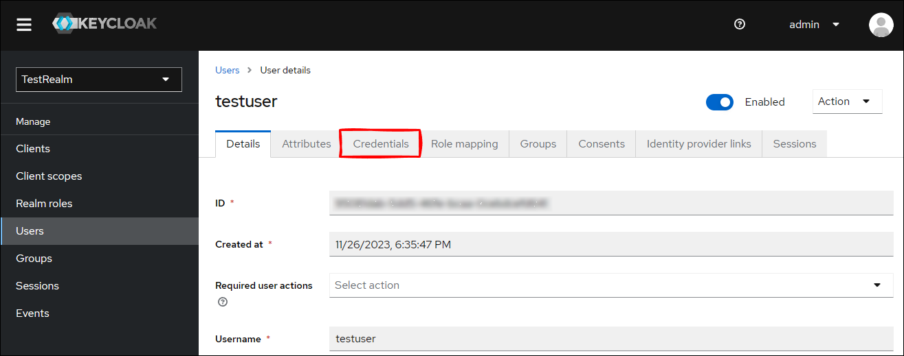 同意した事実は、Keycloak 管理コンソールから TestRealm に移動して、