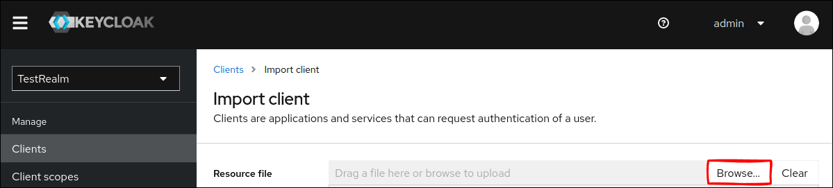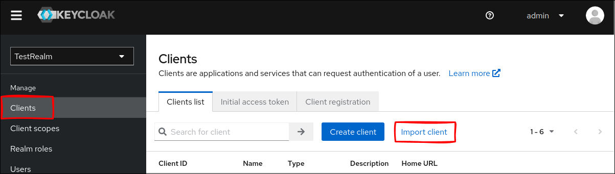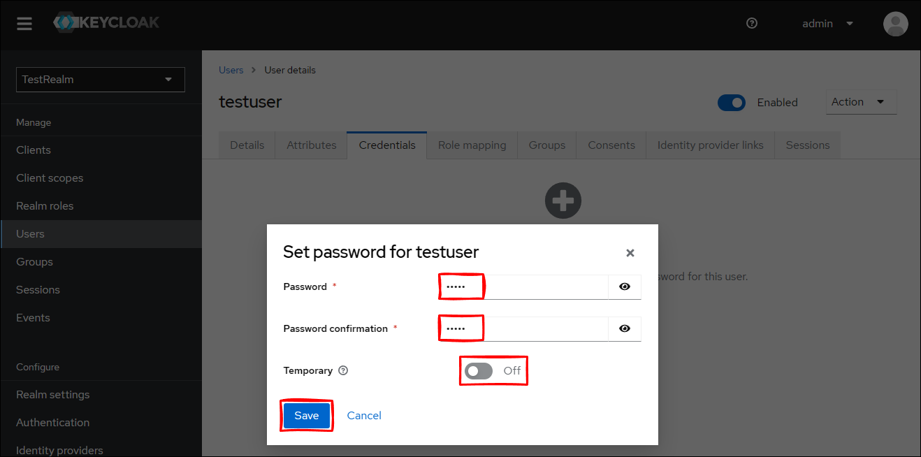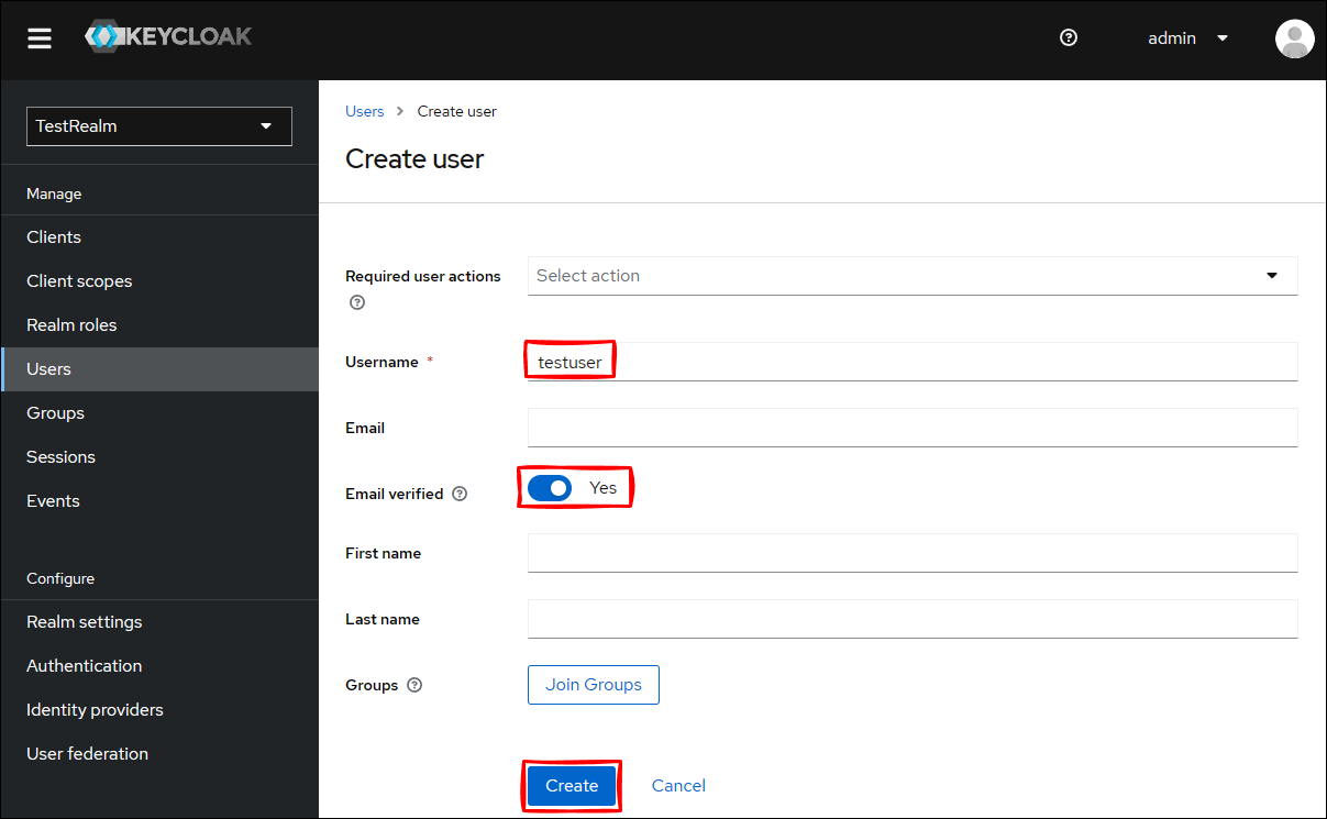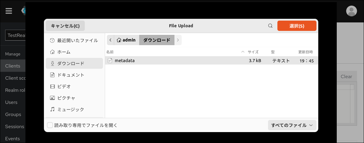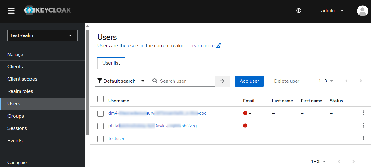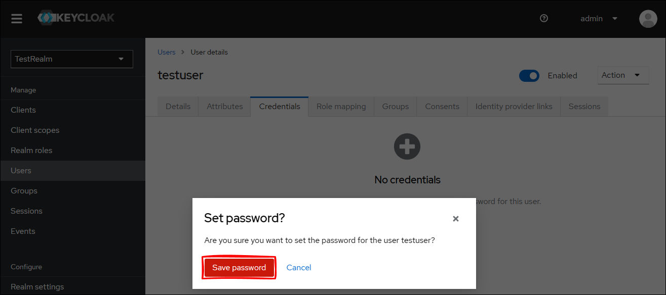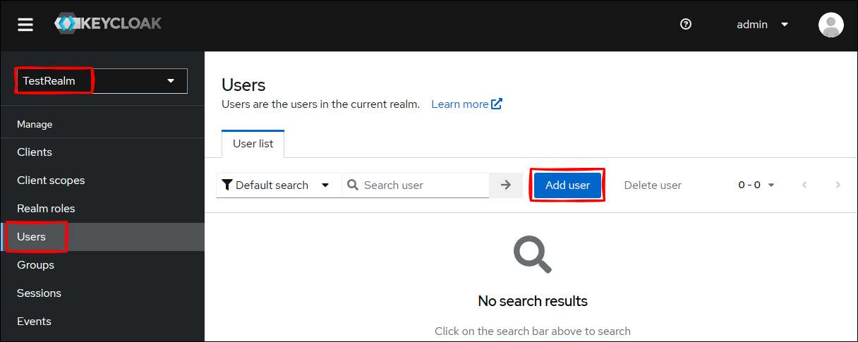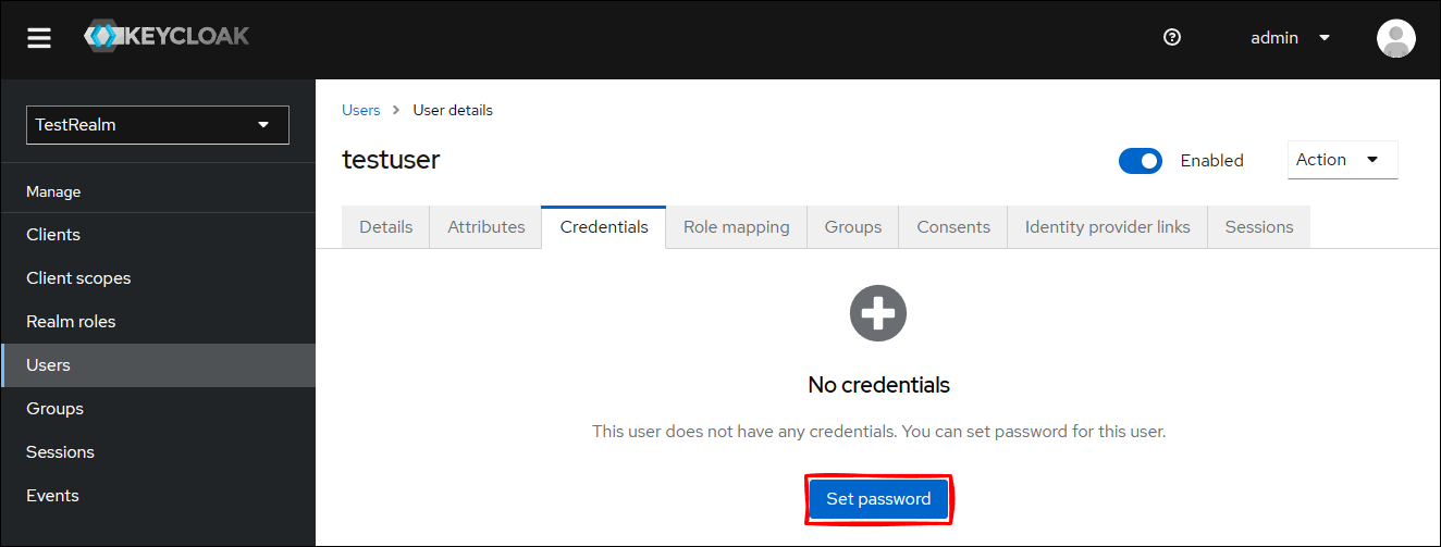 Keycloak 管理コンソールから TestRealm に移動して、
