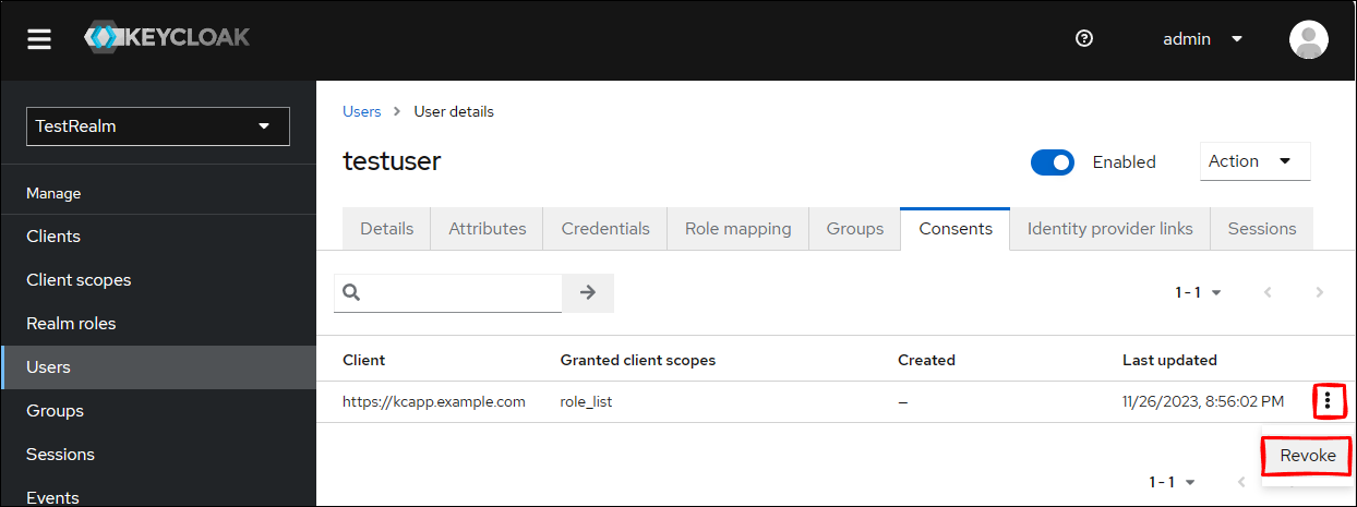Users → testuser → Consents タブにて、確認できて、取り消すこともできます。(取り消すと、もう一度同意画面が出てきます。)