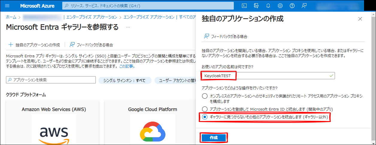 ギャラリーに見つからないその他のアプリケーションを統合します (ギャラリー以外) にチェックが入った状態とし、作成 をクリックします。