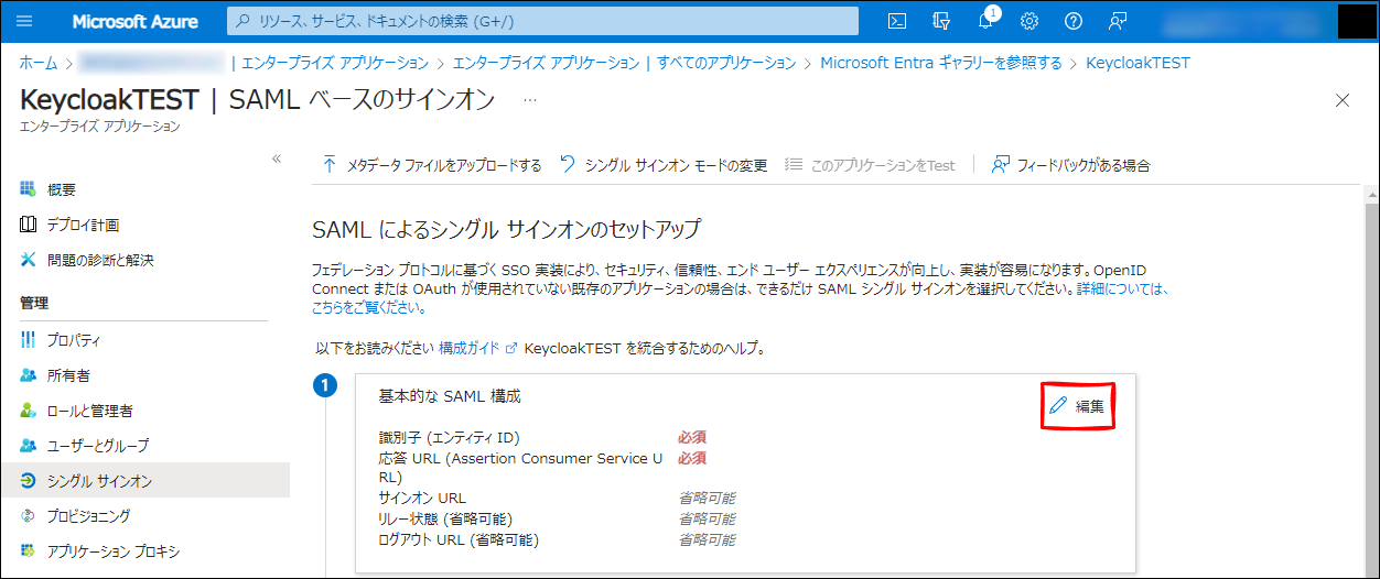 応答 URL (Assertion Consumer Service URL) もこの後 Keycloak の設定画面で固定のエンドポイント URL が表示されるからこの URL です。ここでは、両方分かっているものとします。