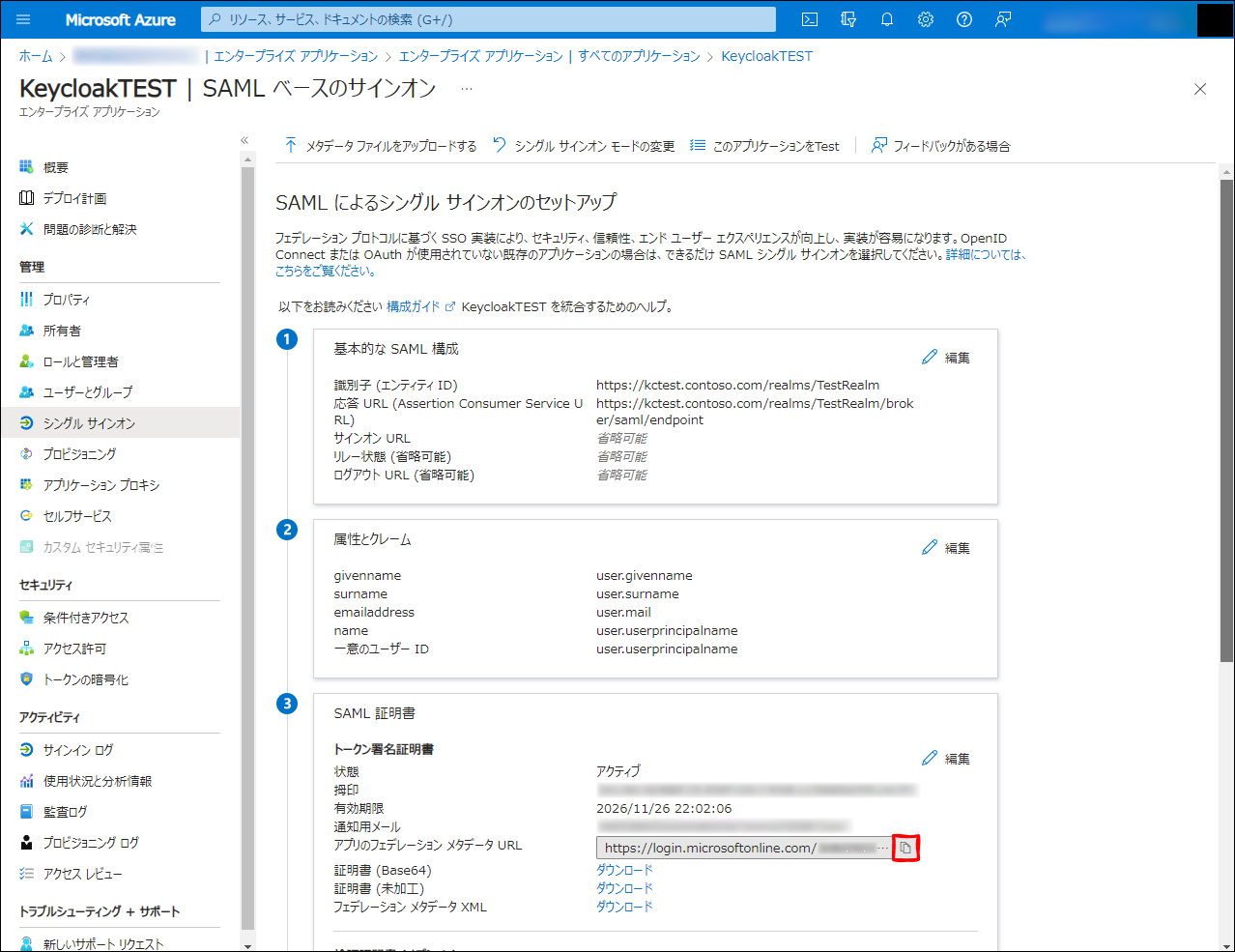 ここで、アプリのフェデレーション メタデータ URL をコピーして、メモっておきます。※後でも見に来れます。