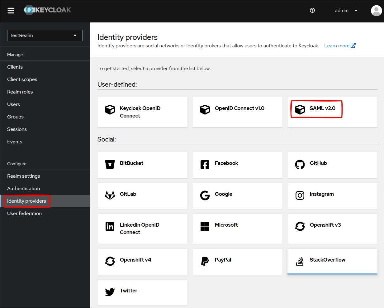 Identity providers をクリックして、SAML v2.0 をクリックします。