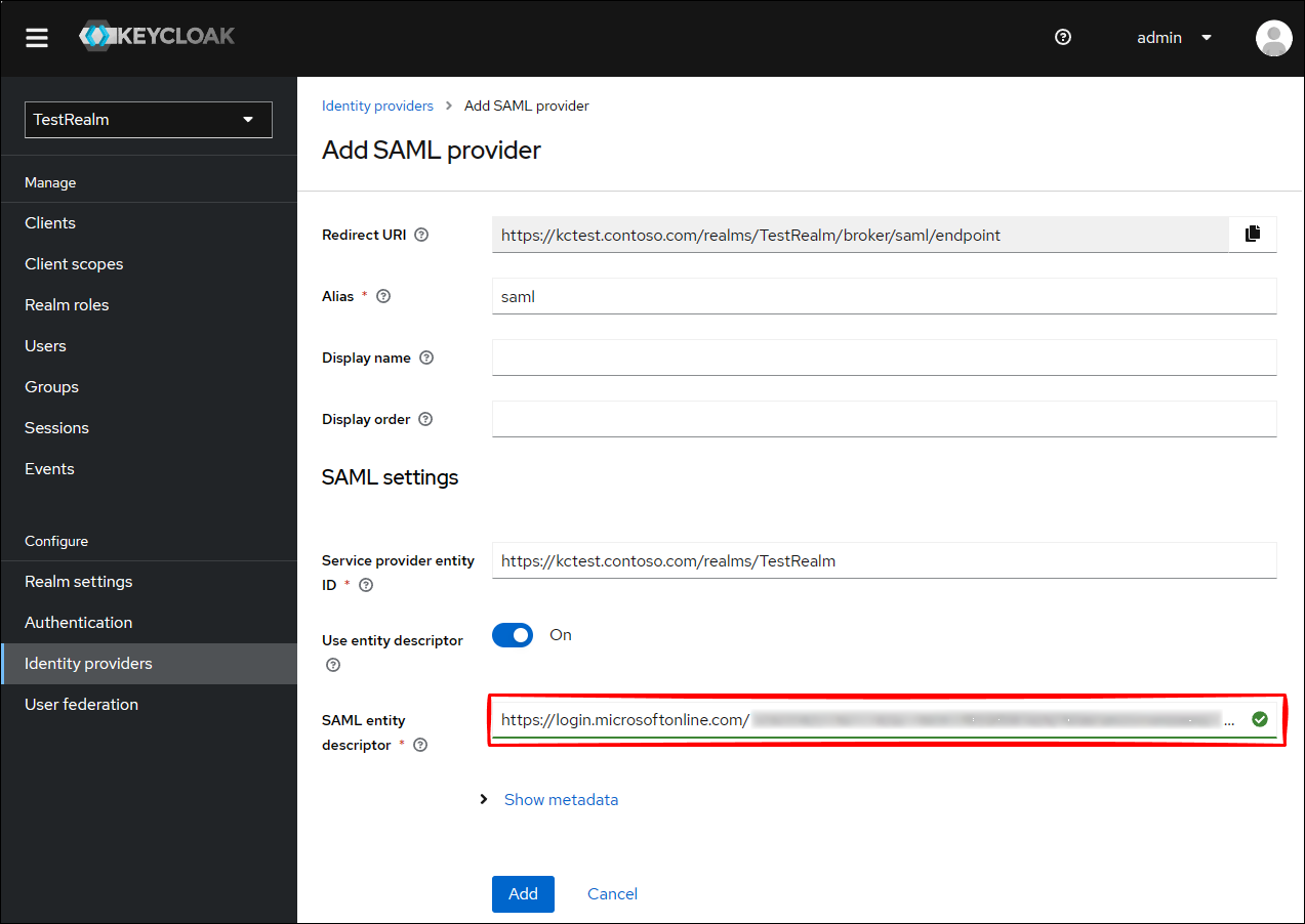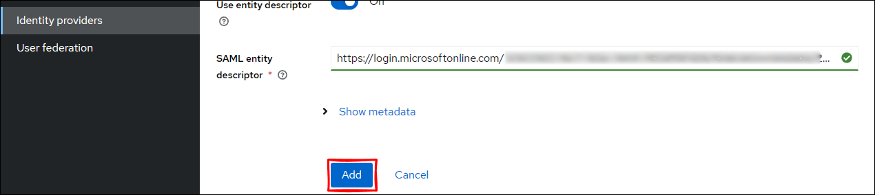 SAML entity descriptor の URL が認識されたら、Add をクリックします。
