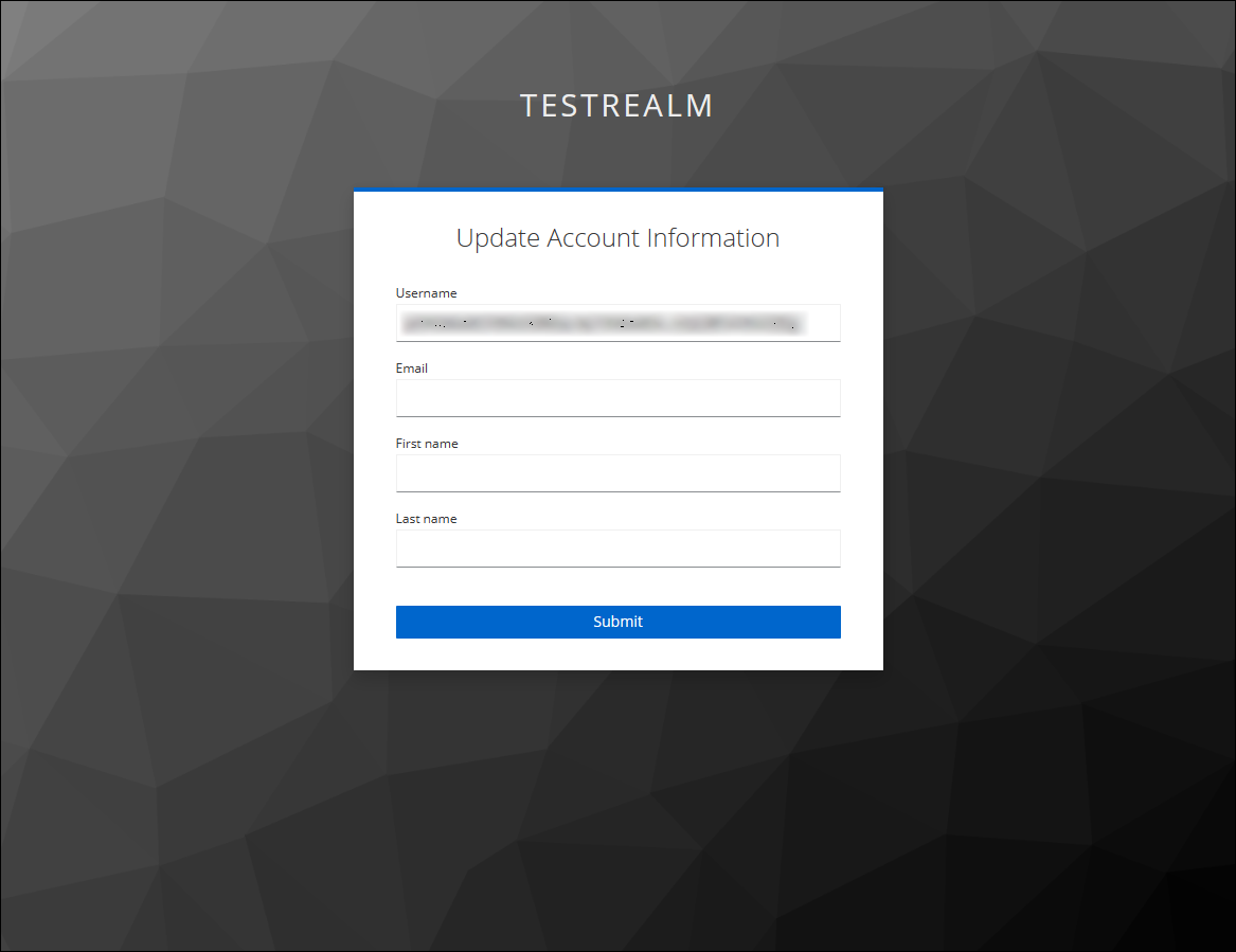 の設定が first broker login となっているため、最初に Username, Email, First name, Last name の登録を迫られます。