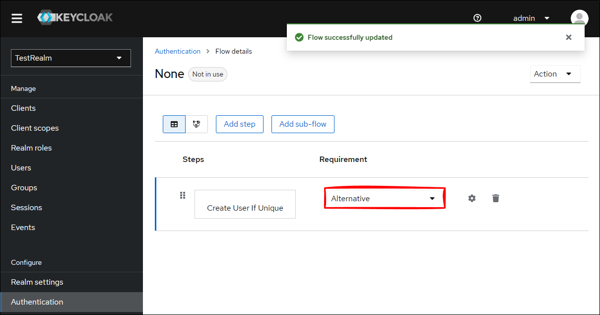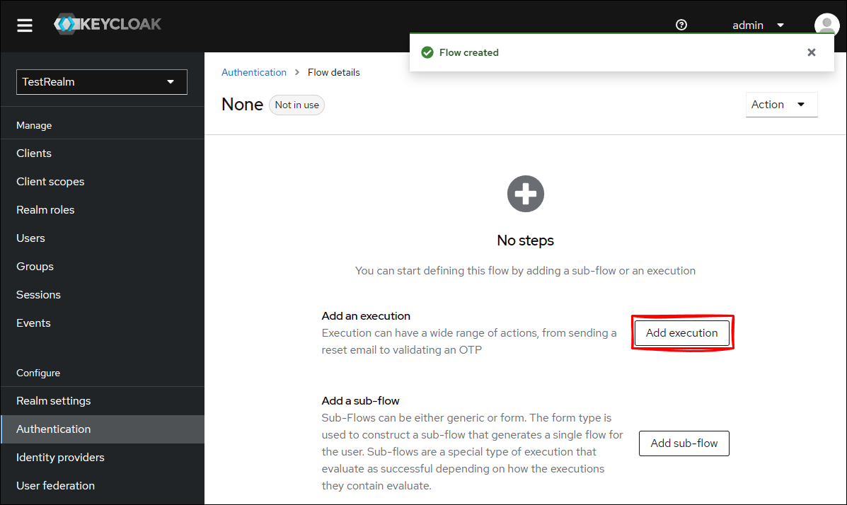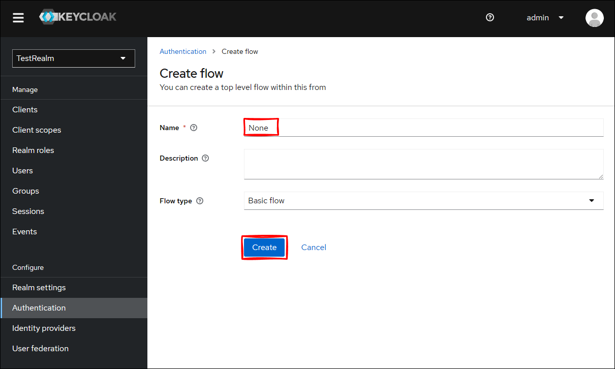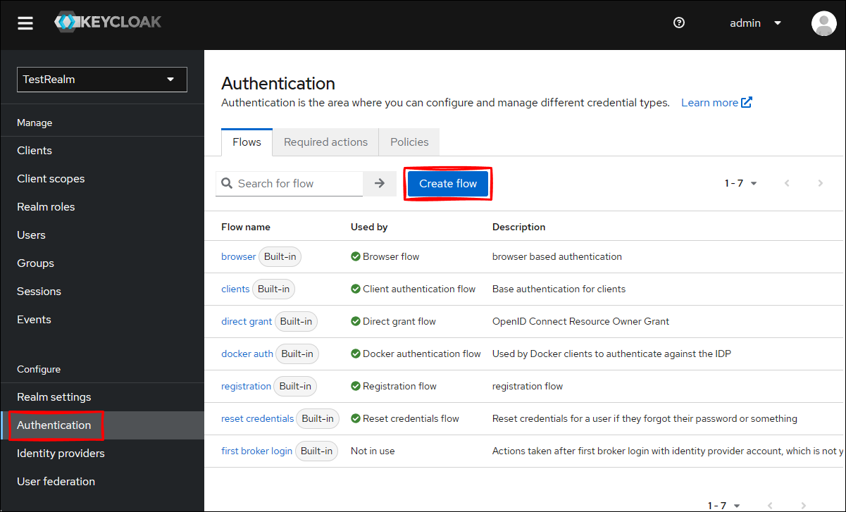 Keycloak 管理コンソールから TestRealm に移動して、 Authentication をクリックして、Create flow をクリックします。