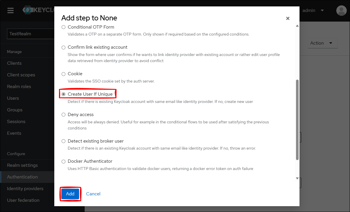Create User If Unique にチェックを入れて、Add をクリックします。
