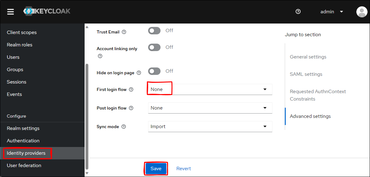 Identity providers → saml → Advanced settings - First login flow