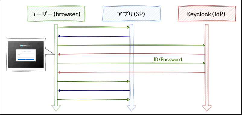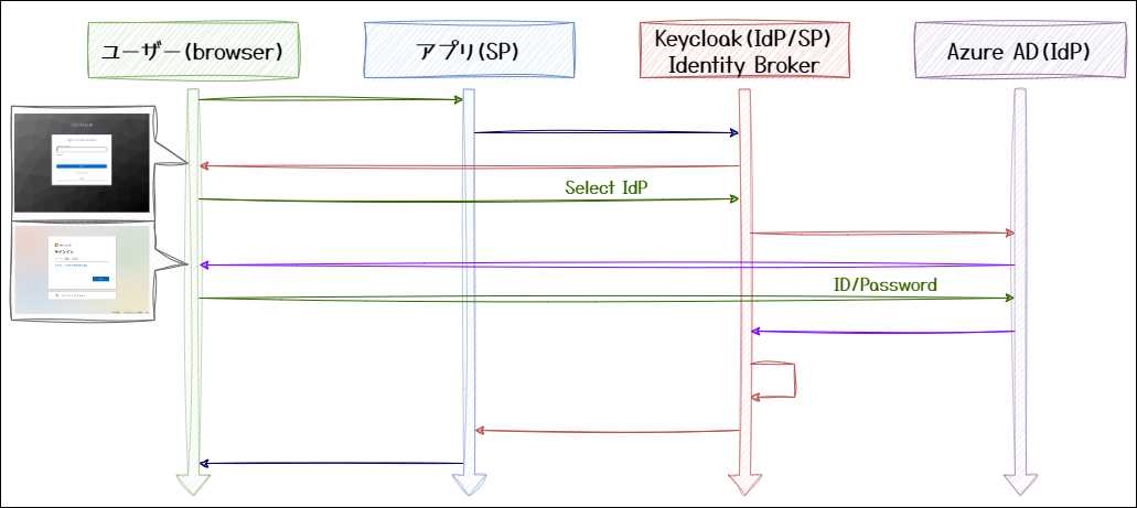 アプリ - Keycloak - Azure AD の場合、Keycloak は、仲介サービス(Identity Broker)として機能します。