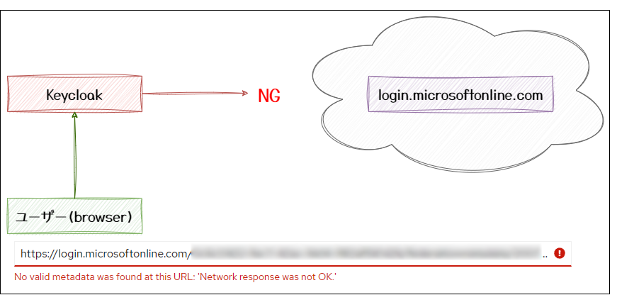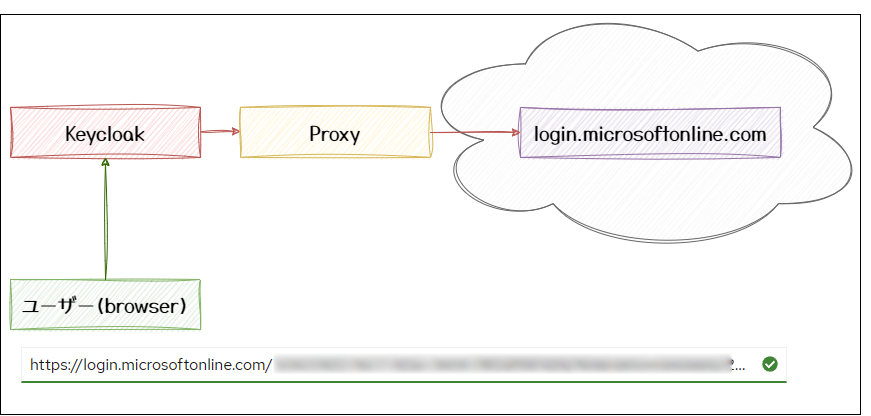 ここで、Keycloak → https://login.microsoftonline.com/... とサーバーサイドでアクセスが行きます。
