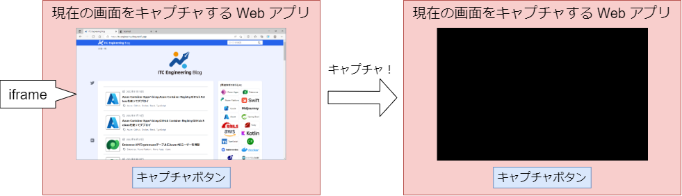 iframe は、別の世界線のため、情報を得られず、真っ暗になります。(同一オリジンの Web ページの場合は、キャプチャ可能と思われますが、今回はそうでないものとします。)