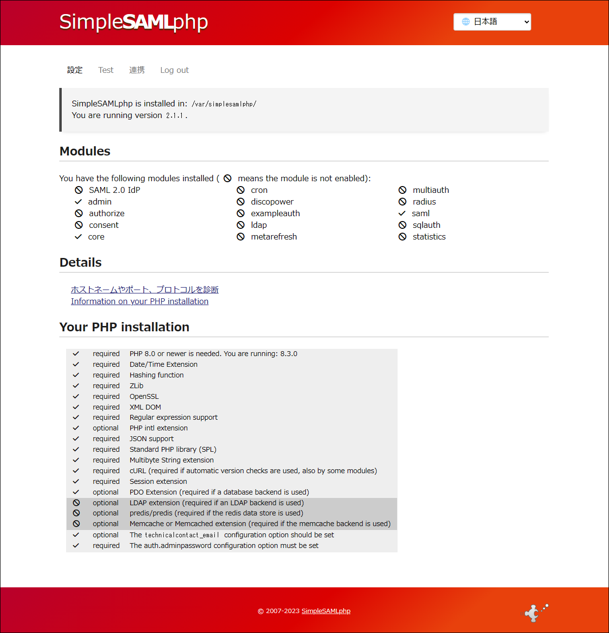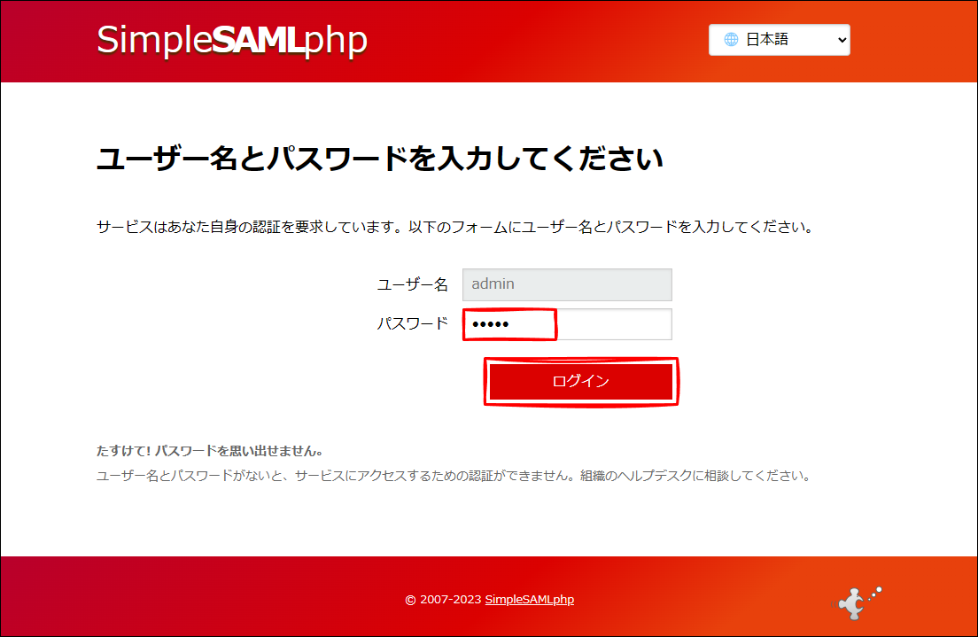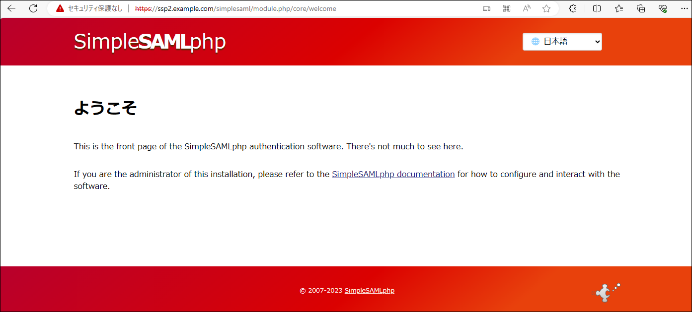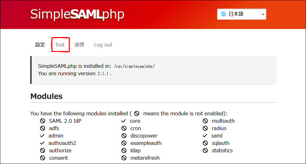 この記事の本題は、SimpleSAMLphp の Web コンソール管理者画面を表示したところからスタートです。